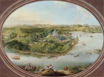 . Der Jagdherr gab dann dem ermattet zusammengebrochenen Tier mit dem Hirschfänger den Todesstoß. War der Hirsch immer noch stark genug, sich zu wehren, mußte ihm ein Jäger mit einer Jagdplaute die Sehnen durchschneiden.Das Wasserjagen war eine Sonderform, bei dem die Tiere in Seen, Teiche, Flüsse und selbst in künstlich angelegte Bassins getrieben wurden. (Kat.-Nr.40) Die schwimmenden Tiere konnte man vom Land aus leicht abschießen. Gelegentlich stiegen die Jäger in prachtvoll geschmückte Gondeln und vollzogen ihr Jagdtreiben aus nächster Nähe. Manchmal schaute die Jagdgesellschaft auch nur zu, wie die Hunde die im Wasser treibenden Tiere rissen. Auch diese Jagden endeten oft in Festen zu Ehren der Göttin Diana und in Musikaufführungen28