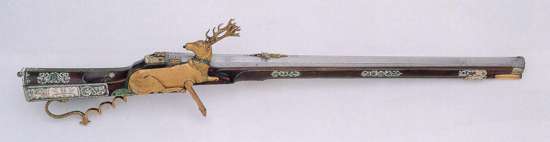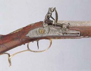 . (Kat.-Nr.49) Die abgebildete Steinschloßflinte, ein Wender, wurde 1686 hergestellt. Bei dem doppelläufigen Wendergewehr werden die Läufe von Hand gedreht und rasten in eine Nut des Kolbens ein. Jeder Lauf besitzt eine Pulverpfanne und eine Schlagfläche. Bei einem zweiten Schuß brauchte man nur den Hahn erneut zu spannen und den nächsten Lauf in Schußposition zu drehen. Der technisch anspruchslose Mechanismus war am Ende des 17. Jahrhunderts bei einer breiten Käuferschicht beliebt, was viele Büchsenmacher dazu veranlaßte, Waffen nach diesem Prinzip herzustellen.In Deutschland gehörten am Ende des 18. Jahrhunderts nur wenige Büchsenmacher zu den international geschätzten Handwerkern, so zum Beispiel die Büchsenmeisterdynastie Kuchenreuther aus Regensburg, die sich der Dominanz der französischen und englischen Handwerker erwehren konnte. Die Arbeiten dieser Büchsenmacher zeichneten sich weniger durch eine aufwendige Gestaltung als durch große Präzision aus47