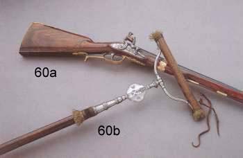 Eine selbständige Waffengattung bildeten die Windbüchsen, bei denen Preßluft als Treibmittel für die Geschosse eingesetzt wurde. Im wesentlichen gab es dabei zwei Varianten: Die Luft wurde entweder im Moment des Abschusses komprimiert oder konnte nach dem Öffnen eines Ventils über ein Druckgefäß entweichen. Die ersten Windbüchsen tauchten in der Mitte des 17. Jahrhunderts auf. Später waren die Waffen praktisch mit einem abschraubbaren Druckgefäß in Form einer Messingkugel unter dem Lauf ausgestattet oder hatten eine Windflasche als Kolbenersatz. (Kat.-Nr.59) Die Windflaschen wurden mit einer Luftpumpe per Hand gefüllt, und die derart komprimierte Luft reichte für mehrere Schüsse48