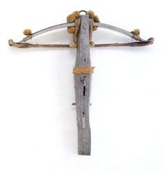 Als Spannhilfe benutzten die Schützen im mitteleuropäischen Raum vielfach eine Zahnstangenwinde, die aus einer gezahnten Stange mit einer zweifingrigen Krappe für die Armbrustsehne und einem großen Zahnrad bestand, die in einem Kasten fest montiert waren. (Kat.-Nr.31, 32, 33)