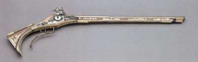 . Eine naheliegende Lösung waren mehrläufige Waffen, die bis zum 18. Jahrhundert eher als schwerfällige Sonderkonstruktionen existierten. Die eigentliche Blüte dieser Waffen begann im 19. Jahrhundert, als man Läufe aus dünnwandigem Stahl herstellen konnte. Zu den mehrschüssigen Waffen gehörten auch die Wender, die im 18. Jahrhundert große Verbreitung fanden. Bei diesem System waren die Läufe drehbar am Hinterschaft montiert. Daneben gab es Gewehre, an denen verschiedene Schloßsysteme, so zum Beispiel Lunten- und Radschloß, miteinander kombiniert wurden, so daß beim Versagen einer Variante immer noch die andere funktionierte. Die frühesten Exemplare entstanden bereits zu Beginn des 16. Jahrhunderts. Auch verschiedene Blankwaffen, wie Hirschfänger oder Sauspieße, wurden mit Schußwaffen kombiniert. Diese Kombinationswaffen waren aber vorwiegend die Produkte experimentierfreudiger Handwerker und hatten für die praktische Jagdausübung nur einen geringen Vorteil.Eine von den üblichen Formen der Radschloßwaffen abweichende Gestaltung kennzeichnet die Tschinken. Wie aus archivalischen Quellen hervorgeht, leitet sich der Name von der schlesischen Stadt Teschen her. Die leichten Tschinken eigneten sich für die Jagd auf sitzende Vögel, kamen jedoch für das Flugwildschießen aufgrund ihres gezogenen Laufes und des kleinen Kalibers nicht in Betracht. Ihre größte Blüte erlebten die Waffen im 17. Jahrhundert, als in der höfischen Gesellschaft das öffentliche Vogelschießen in Mode kam. Charakteristisch für diese Waffen sind das außenliegende Rad und die ebenfalls außenliegende Schloßfeder. Die Montage der Schloßteile am Schaft war wegen des schlanken, leicht nach unten gebogenen Schafthalses notwendig. Die Gestaltung der Waffe wirkt zerbrechlich, da aber das kleine Kaliber keinen nennenswerten Rückstoß hinterließ, war die grazile Gestaltung nicht von Nachteil. Viele Tschinken sind mit eingelegten Bein- und Perlmuttplättchen verziert. Motivisch dominieren neben geometrisch angeordneten gravierten und gefärbten Beineinlagen auch Wild- und Fabeltiere. (Kat-Nr.47)
