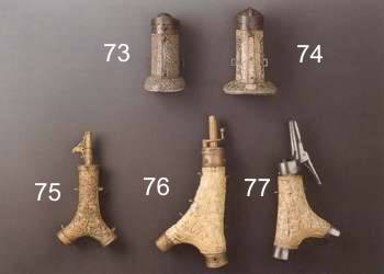 (Kat.-Nr.38) Als herausragende Jagdwaffen wurden die Armbrüste besonders aufwendig verziert, an ihrer Herstellung beteiligten sich mehrere Gewerke und Beinschneider; Graveure oder Ätzmaler übernahmen die dekorative Ausstattung. Der Bogen wurde oft mit Blüten und Rankenwerk geätzt. Auf der Säule belegten die Kunsthandwerker die freien Flächen mit gravierten, bemalten oder im Relief geschnittenen Hornplatten. Auf diese Weise entstanden Szenenfolgen mit damals beliebten antiken oder biblischen Motiven. Die biblischen Themen waren im 16. Jahrhundert so sehr verbreitet, daß die Gestalter an ihre ursprüngliche religiöse oder symbolische Bedeutung kaum noch dachten. Die Stiche der Kleinmeister waren nicht selten großen Arbeiten entlehnt und fanden in zahlreichen Kopien Verbreitung. Diese Musterblätter und Kompositionen dienten als Vorlagen für ganz verschiedene Gegenstände, und sie wanderten von Werkstatt zu Werkstatt. Bei der Wahl der Vorlage entschieden die Art der Komposition und die Größe, weniger der Inhalt. So ist es verständlich, daß nicht nur auf Armbrüsten, sondern auch auf anderen Waffen, sofern sie eine größere Fläche boten, unterschiedliche Themen unmittelbar nebeneinander standen. Entsprechend ihrem Verwendungszweck dominierten Jagdszenen als häufigstes Motiv. Ranken und Blütenornamente stellten auf geschickte Weise die Verbindung der einzelnen Darstellungen her. (Kat.-Nr.30)Am Ende des 16. Jahrhunderts setzten sich, vorwiegend für die Jagd auf Vögel und Kleintierwild, besonders leichte Armbrüste, die italienischen Balester und deutschen Schnepper, durch, mit denen man Kugeln verschießen konnte17