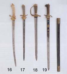 . Eine ähnliche Rolle wie den Hirschfängern kam den Jagdplauten als Standeszeichen der Jäger zu. Trotzdem unterscheidet sich der "Jagdsäbel" im Aussehen und in der Verwendung vom Hirschfänger, denn mit dieser Waffe wurden dem bei einer Paforcejagd gestellten Hirsch die Sehnen durchgeschnitten, bevor dieser durch den Jagdherrn erlegt wurde. (Kat.-Nr.15, 16, 17)Die Sauspieße des 18. Jahrhunderts unterschieden sich nicht von ihren Vorgängern, ihre Klingen waren vielfach mit einem Herrschermonogramm belegt und dokumentierten dadurch die enge Bindung der Jagdveranstaltungen an die Interessen des Hofes. Die Jagd mit dem Sauspieß hatte schon im 16. Jahrhundert ihre praktische Bedeutung verloren, und im Zeitalter des Barock kam den Waffen nur noch ein symbolischer Wert zu. Am Ende des 18. Jahrhunderts benutzte der adlige Jäger den Jagdspieß einzig bei Tierhetzen und Kampfjagden im Rahmen aufwendiger Hoffeste.
