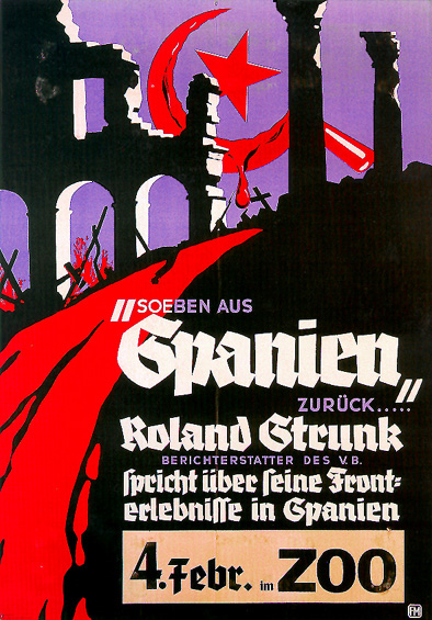 Kampfbereitschaft schüren in Deutschland vor allem die Berichte von nationalsozialistischen Teilnehmern an den innerspanischen Auseinandersetzungen. Eine Ankündigung zu einem Vortrag am 4. Februar spiegelt die Siegesstimmung im rechten Lager wider. Als Verursacher des Bürgerkriegs in Spanien, den ein Trümmerszenario mit Kreuz bezeichnet, wird der (internationale) Kommunismus denunziert. In Anspielung auf die Insignien der Sowjetunion schweben ein roter Stern und eine bluttriefende Sichel bedrohlich wie das Damoklesschwert am Himmel. Über die Ruinen ergießt sich ein Sturzbach aus Blut. Die Sichel steht hier als Zeichen für den Schnitter oder Sensenmann. An der Aussage besteht kein Zweifel: So, wie die "Roten" Spanien den Tod brachten, haben sie auch weiterhin nur Morden im Sinn.