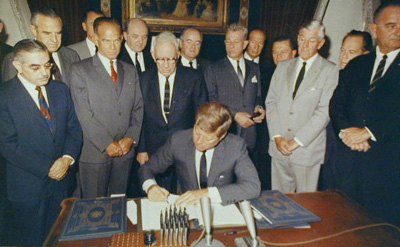 Kennedy unterzeichnet das Atomteststoppabkommen, 7. Oktober 1963 Kennedy signing the Nuclear Test Ban Treaty © John Fitzgerald Kennedy Library, Boston