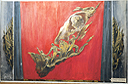 Nach der Befreiung der Ukraine entdeckt die Rote Armee ihre Leichen in einem Massengrab. Posthum erhielten die jungen Märtyrer die Auszeichnung „Helden der Sowjetunion“. Der Entwurf für das Bühnenbild der Inszenierung an der Kiewer Staatsoper von 1947 zeigt vor flammend rotem Hintergrund eine Gruppe junger Kämpfer, die mit wehender Fahne einen Hang empor stürmen, das hohe Ziel vor Augen und bereit, jedes Opfer zu bringen. |