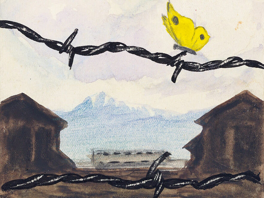 Hier sitzt ein gelber Schmetterling hoch über der dunklen Wirklichkeit und verkörpert die Hoffnung auf einen kommenden Frühling. Der Stacheldraht überwölbt den Blick auf die Berge an der spanischen Grenze im Hintergrund. Die gewählte Perspektive macht deutlich, dass Kunst im Lager auch hergestellt wurde, um Mut und Zuversicht zu vermitteln.