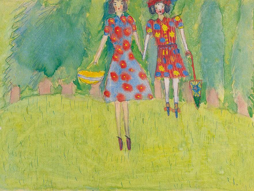 Dieses Gemälde stammt von einem achtjährigen Mädchen. Es zeigt zwei Mädchen, vielleicht auch Mutter und Tochter, die vor einem dichten Wald über eine sonnige Wiese schlendern. Beide sind fröhlich und hübsch gekleidet. Liebevoll hat die junge Künstlerin ihre beiden Figuren mit kleinen Details geschmückt.