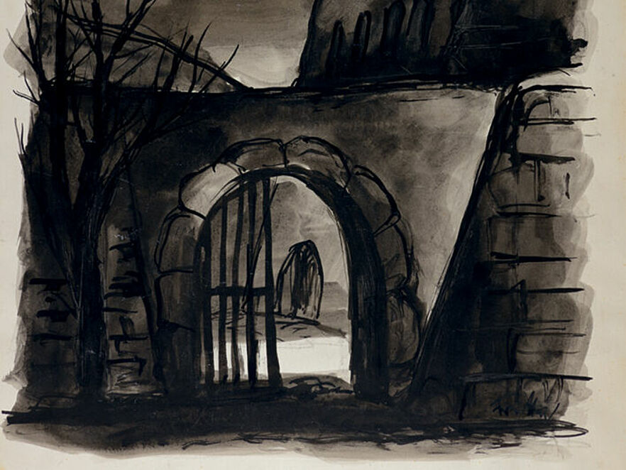 Auf der menschenleeren Tuschezeichnung Bedřich Frittas bilden Natur und Architektur die unheilvolle Kulisse zu einem Geschehen, das hier unsichtbar bleibt. Er zeigt bedrohlich aufragende Mauern und ein halboffenes Tor als Metaphern des Todes. Ohne sichtbare Alternative führt der einzige Weg in die Dunkelheit.