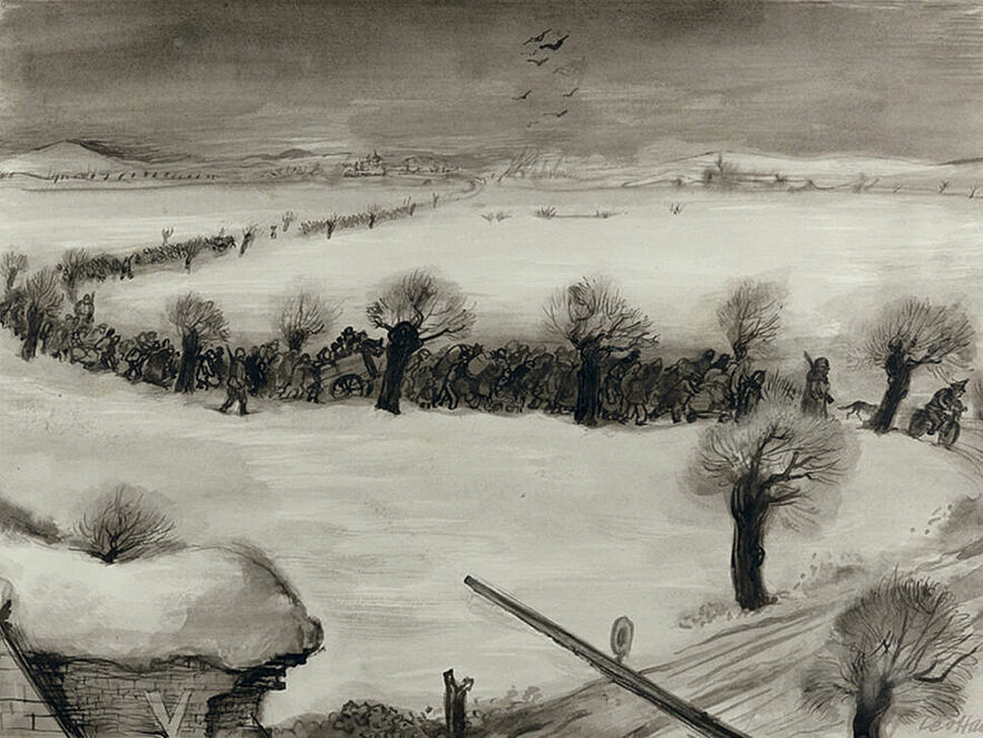 Das erzählte Leo Haas über seine Lagerhaft in einem Interview in Ost-Berlin 1981. Er war der einzige aus der Künstlergruppe des Ghettos, der den Krieg überlebte. Zum Zeitpunkt seiner Befreiung war er 44 Jahre alt. Einige seiner rund 500 Zeichnungen wurden als anschauliche Beweise vor Gericht benutzt. Trotz seiner dokumentarischen Absicht ist die lavierte Tuschezeichnung über die Ankunft eines Transports ein durchkomponiertes Kunstwerk. Kahle schwarze Bäume bilden ein unheilvolles Spalier am Wegesrand. Wie Todesboten kreisen Raubvögel über dem langen, einsamen Zug von Menschen durch eine kalte, trostlose Landschaft. Neben das Tor des Ghettos aber, in die linke, untere Ecke des Bildes, zeichnete Haas den Buchstaben V – als Sinnbild für den Widerstandskampf der Künstler.