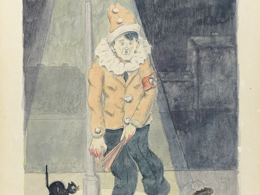Umso erstaunlicher ist diese kolorierte Zeichnung des Prager Arztes Pavel Fantl. Sie zeigt Adolf Hitler als einen erbärmlichen Clown. Blut tropft von seinen Händen. Das Instrument, auf dem er seine gewalttätigen Melodien spielte, liegt mit zerrissenen Saiten auf dem Boden. Die heimlich entstandene Zeichnung drückt eine tiefe Sehnsucht aus und ist zugleich eine Vorhersage: „Das Lied ist aus“, schrieb Fantl auf Tschechisch unter sein Werk. Dies bezeugt die Furchtlosigkeit und den widerständigen Humor des Malers.