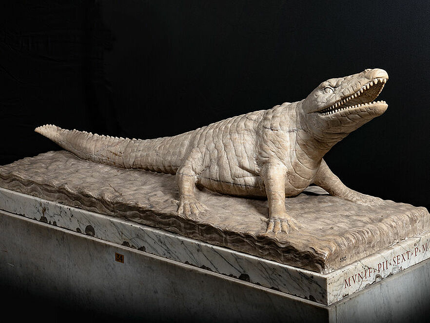 Diesem antiken Krokodil aus weißem Marmor begegnete Alexander von Humboldt in einem Raum der Vatikanischen Museen in Rom, wo restaurierte antike Tierskulpturen zu einer Art steinernem Zoo arrangiert waren. Nach seiner Amerikareise besuchte Alexander 1805 seinen Bruder Wilhelm in der Stadt und nutzte jede Gelegenheit, um Bibliotheken, Forschungsinstitute und vor allem Museen zu besuchen. Ausgehend von den Erkenntnissen, die er in Amerika gewonnen hatte, interessierte sich Alexander vor allem dafür, wie Bildhauer und Restauratoren mit anatomischen Details umgegangen waren.
