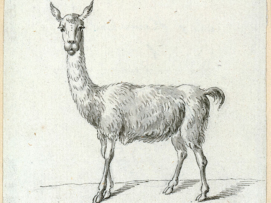 Auch die um 1802 angefertigte Abbildung eines Lamas gehört zu diesem Konvolut. Sie ist am unteren Bildrand mit der Beschriftung „von Alexander von Humboldt“ versehen. Allerdings ist nicht eindeutig geklärt, ob es sich möglicherweise nur um eine Skizze nach Humboldt handelt. In jedem Fall nutzte der Maler Jean-Thomas Thibault die Zeichnung des Lamas für ein großes Landschaftsbild, in dem das Tier vor dem Vulkan Chimborazo zu erkennen ist. Vom Stecher Louis Bouquet in einen Kupferstich übertragen, fand diese Darstellung letztlich Aufnahme in das 1810 von Humboldt und Aimé Bonpland herausgegebene, aufwändig gestaltete Reisewerk Vues des Cordillères, et monumens des peuples indigènes de l’Amérique.