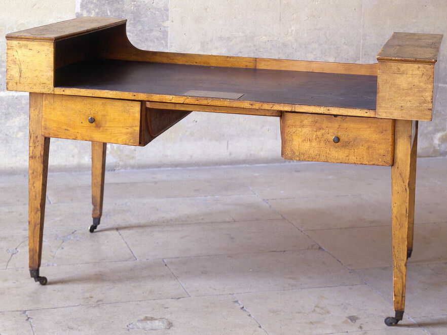 Was erzählt ein Schreibtisch über seinen Besitzer? Alexander von Humboldts Schreibtisch ist schlicht, aus Birkenholz und mit gewachster Leinwand bedeckt, er hat zwei große Schubladen und ein abnehmbares Zeichenbrett. Humboldt kaufte ihn 1827 unmittelbar nach seiner Übersiedlung von Paris nach Berlin und nutzte ihn über 30 Jahre lang bis zu seinem Tod 1859 – unter anderem für die Anfertigung des zweiten Teils seiner Kosmos-Vorlesungsreihe.