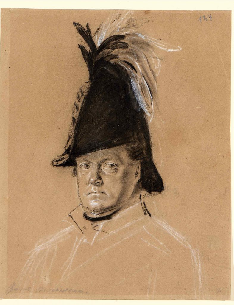 The elderly gentleman with the striking, feathered hat looks rather glum: staring straight at the observer, he reveals almost nothing about himself. Nevertheless, we know that this is a portrait sketch of Prussian General Field Marshal Graf Neidhardt von Gneisenau. The artist Franz Krüger made the drawing in 1818 as a study for an oil portrait of Gneisenau on horseback together with other figures, a so-called retinue picture. The large-format painting belonged to the Gneisenau family from the time it was completed in 1819.