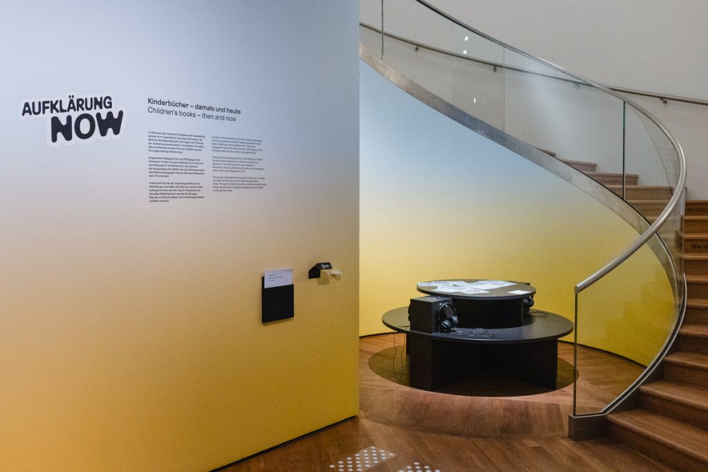 Vier kreative Werke wurden von den Kooperationspartnern gemeinsam mit dem Outreach-Projektteam konzipiert, mit dem Ausstellungsteam diskutiert und in enger Zusammenarbeit mit dem Gestalter, der Grafikagentur, dem Medientechniker und den DHM-Werkstätten produziert. Die Werke fügten sich in die themenbezogenen Ausstellungsbereiche ein und wurden in Kontext zu den entsprechenden Objekten präsentiert. Das Jugendgremium Schattenmuseum gemeinsam mit dem Künstlerkollektiv sideviews gestaltete den Bereich „9m² Wissen aus der Gesellschaft“ zu der Frage „Wie kann die Fliege den Elefanten fressen?“. Dieser Bereich beschäftigte sich mit den Aufklärungsthemen des öffentlichen Diskurses und dem Projekt der Enzyklopädisten. Es wurde ein Wissensspeicher geschaffen, der alle Besucherinnen und Besucher einlud, sich an gesellschaftlichen Diskussionen zu beteiligen und sich mit anderen Meinungen auseinanderzusetzen. Die angehenden Sozialpädagoginnen und Sozialpädagogen im Pestalozzi-Fröbel-Haus kuratierten den Ausstellungsbereich „Kinderbücher – damals und heute“, in dem sie Abbildungen von Johann Bernhard Basedows „Elementarwerk“ mit Illustrationen von aktuellen Kinderbücher wie beispielsweise Ein Mädchen wie Du von Frank und Carla Murphy oder Bestimmt wird alles gut von Kirsten Boie und Mahmoud Hassanein in Vergleich setzten. Ausgehend von ihren Erfahrungen im praktischen Berufsleben thematisierten sie die Darstellungen von Rollenbildern von Geschlechtern, Kleidung, Spiele, Lernen, Berufe und Geburt und schrieben Geschichten zu Kontinuitäten und Wandel in pädagogischen Ansätzen. Dadurch zeigten sie die Normen auf, die bereits im Kindesalter kommuniziert werden. Teilnehmende des Bildungszentrums Lohana Berkins, Migranten und Migrantinnen aus dem lateinamerikanischen Raum, produzierten eine Broschüre mit literarischen Texten und künstlerischen Linoldrucken, die sich mit dem Thema Kolonialismus in der Zeit der Aufklärung und seinen Auswirkungen bis heute auseinandersetzen. Der Wahlpflichtfachkurs Film realisierte zusammen mit young arts Neukölln den Film „(auf)geklärt“, der die universellen Menschenrechte und deren Umsetzbarkeit im Alltag für jeden Einzelnen – in der Geschichte und auch in der Gegenwart – thematisiert.
