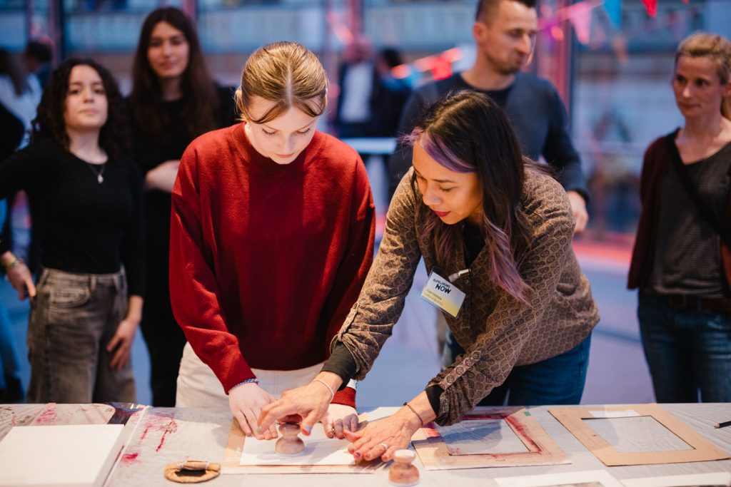 Abbildung 1) Besucher und Besucherinnen tanzen beim Aufklärung NOW-Festival 2) Linoldruck-Workshop angeboten vom Bildungszentrum Lohana Berkins