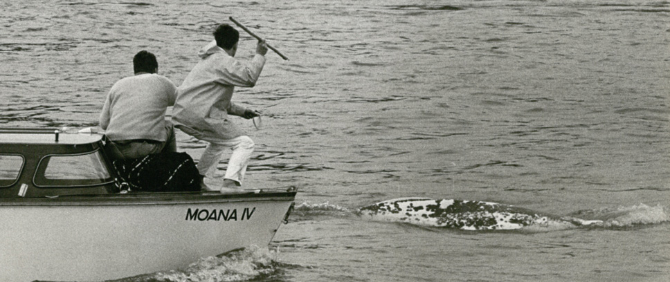 Zurück zum Beluga-Wal 1966: Aufgrund der bedrohlichen Umwelt bemühte sich der Zoodirektor Wolfgang Gewalt den Wal zu fangen und ihn in das Delfinarium des Duisburger Zoos zu überstellen. Aus Sicht der Medien nahm er die Rolle des Kapitäns Ahab aus dem Roman von Melville ein. Versuchte er anfangs mithilfe zusammengeknoteter Tennisnetze den Wal in die Enge zu treiben, wechselte er später zu Betäubungspfeilen, um ihn einzufangen.[20] Zumindest Letzteres war riskant: Wale sind Säugetiere, die zum Atmen an die Oberfläche kommen müssen. Ein betäubter Wal konnte daher ertrinken. Schlussendlich schlugen alle Versuche fehl und der Zoodirektor stellte die Jagd nach „Moby Dick“ am 10. Juni 1966 ein. Nicht nur aufgrund des mangelnden Jagderfolges, sondern auch weil die Öffentlichkeit seine Jagdmethoden ablehnte. Während manche*r besorgte*r Bürger*in einen Verstoß gegen den Tierschutz vermutete und Strafanzeige stellte, charterten Aktivist*innen ein Luftschiff, um den Zoodirektor mit geworfenen Orangen von seinem Fangversuchen abzuhalten.[21] Die Bild-Zeitung forderte gar: „Verhaftet Dr. Gewalt!“[22]
