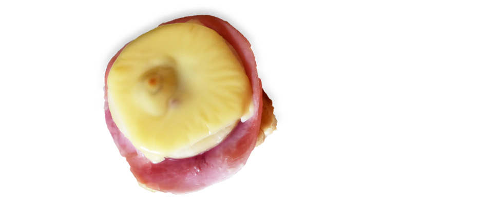 Weißbrot in Kastenform, magerer Schinken, Büchsenananas, dünne Käsescheiben, entsteinte Sauerkirschen. Weißbrot leicht toasten, dünn mit Butter bestreichen, nacheinander 1 Scheibe Schinken, 1 Scheibe Ananas, 1 Scheibe Käse darauf legen. Das Ganze übertoasten, mit einer Sauerkirsche garnieren, heiß servieren. — Liesel Friese-Fickenscher, „Wir haben Gäste, wir feiern Feste!” (1961)