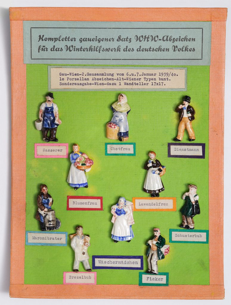Außer propagandistischen Gemälden wie „Kämpfendes Volk“ von Hans Schmitz-Wiedenbrück (1907-1944) (Abb. 3) sind es die vergleichsweise unscheinbaren Dinge, die aufgrund ihrer Zurückhaltung aussagekräftig sind, etwa die für das „Winterhilfswerk des Deutschen Volkes“ verkauften und zur Bildung der „Volksgemeinschaft“ beitragenden Anhänger (Abb. 4).
