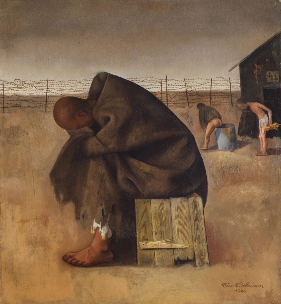 Den Bereich des jüdischen Lebens im Nationalsozialismus, der für das Ostberliner Geschichtsmuseum mit seiner marxistisch-leninistischen Sicht kaum von Bedeutung gewesen war, bringt das DHM seit seiner Gründung 1987 ein.[10] Zu den frühen und herausragenden Erwerbungen gehört das Gemälde „Kauernder Gefangener“ (Abb. 5) des jüdischen Malers Felix Nussbaum (1904-1944). Im Jahre 2021 erwarb das DHM die umfangreiche, über Jahrzehnte zusammengetragene Sammlung Wolfgang Haney (1924-2017) zum nationalsozialistischen Antisemitismus, die hauptsächlich aus Dokumenten besteht.[11]