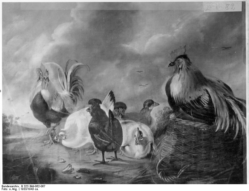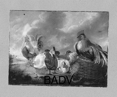 Hahn auf einem Korb und Hennen
