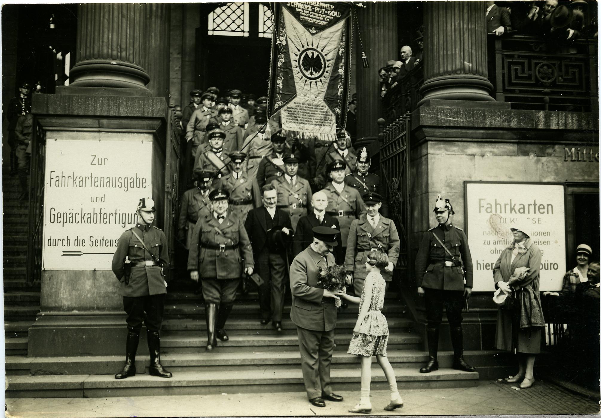 Vorne (mit Blumen) Otto Hörsing (1874-1937), Bundesvorsitzender des Reichsbanners.