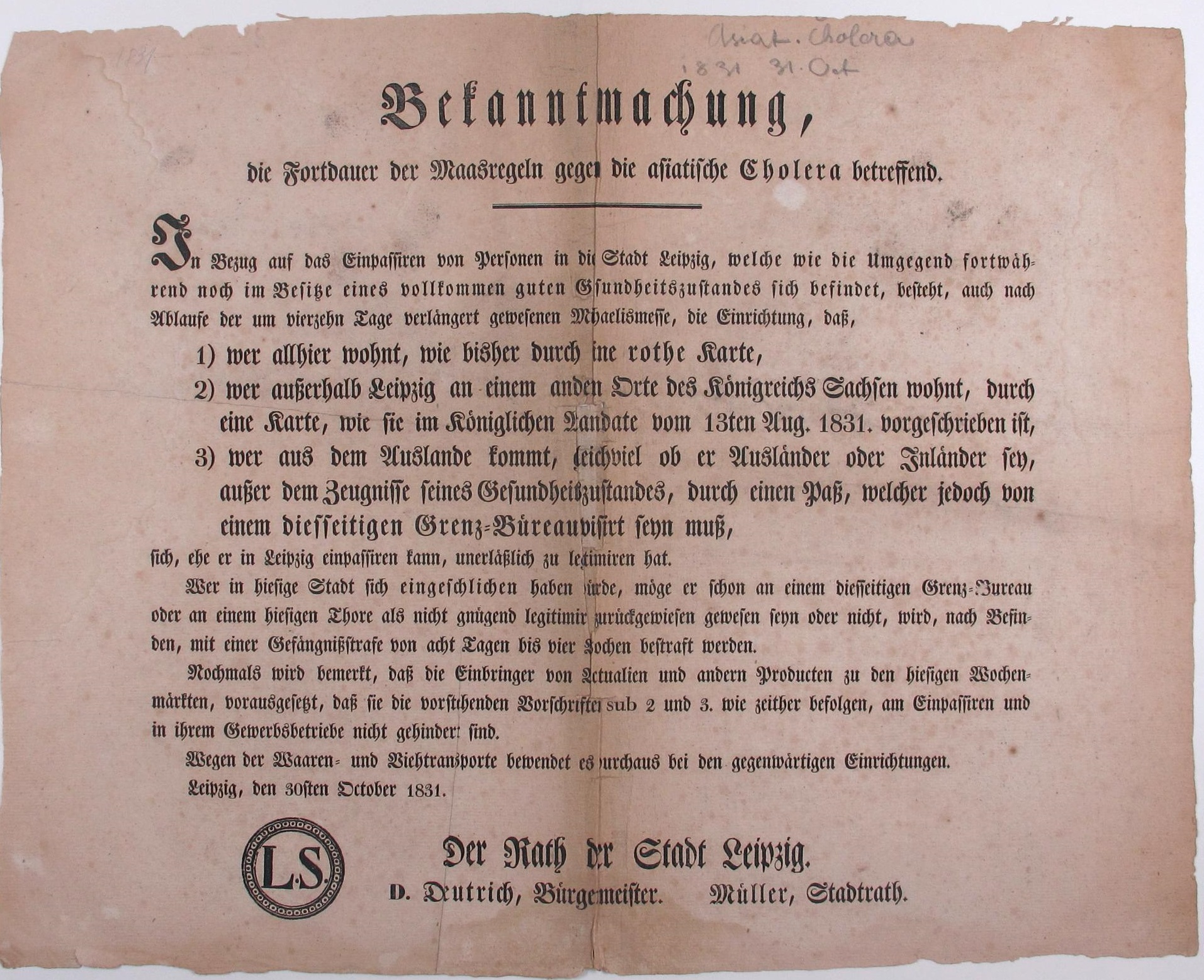 Dessen Mitgliedsstaaten versuchten sich gegen die Einschleppung der todbringenden Krankheit zu schützen: Bereits 1830 wurde von der österreichischen Regierung ein Programm zur Seuchenabwehr publiziert, das auch für viele der deutschen Staaten Vorbildcharakter erlangte. Durch Errichtung eines militärischen Sperrgürtels an den Grenzen, eines sogenannten Gesundheits-Cordons, die Einschränkung des Schiffsverkehrs auf Binnengewässern und Flüssen sowie die Schließung der Seehäfen sollte die Cholera außerhalb der eigenen Grenzen gehalten werden. Auch die vermeintliche Desinfizierung von gehandelten Waren mit Chlorgas und strenge Quarantänevorschriften für Reisende aus betroffenen Gebieten waren gängige Methoden der Seuchenvermeidung. Inländern war das Reisen nur mit Besitz einer „Legitimations-Karte“ gestattet, die dem Reisenden die Gesundheit bestätigten.