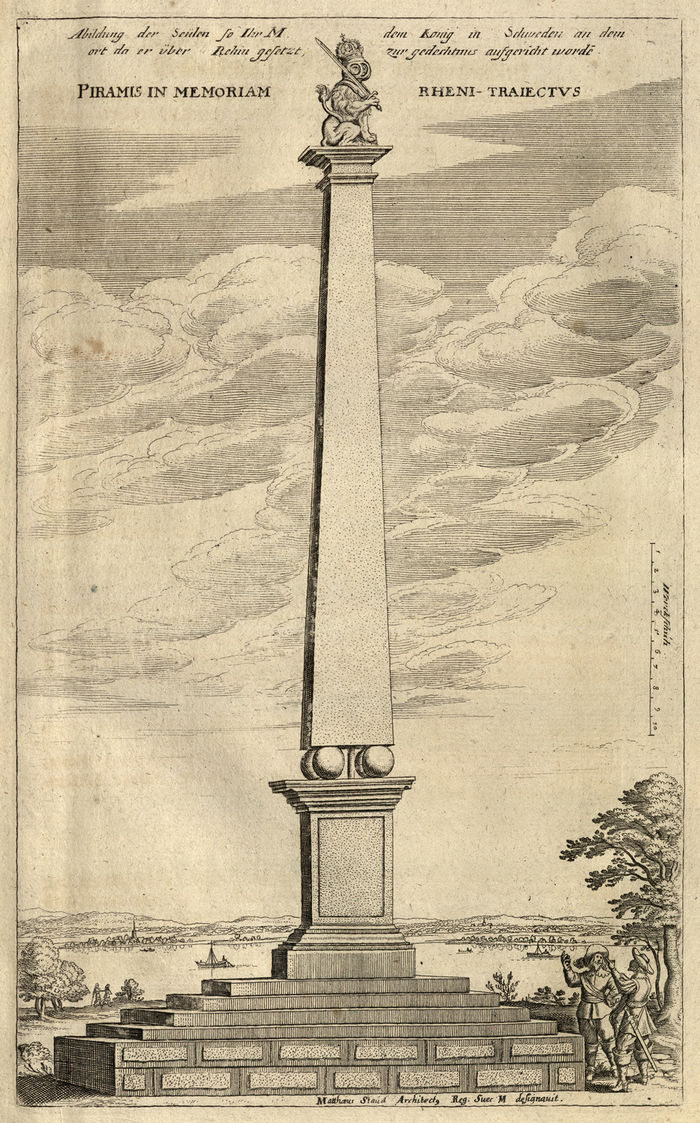 Originaltitel: Abbildung der Seülen so Ihr M. dem konig in Schweden an dem ort da er über Rehin gesetzt, zur gedechtnus aufgericht worden. PIRAMIS IN MEMORIAM RHENITRAIECTVS