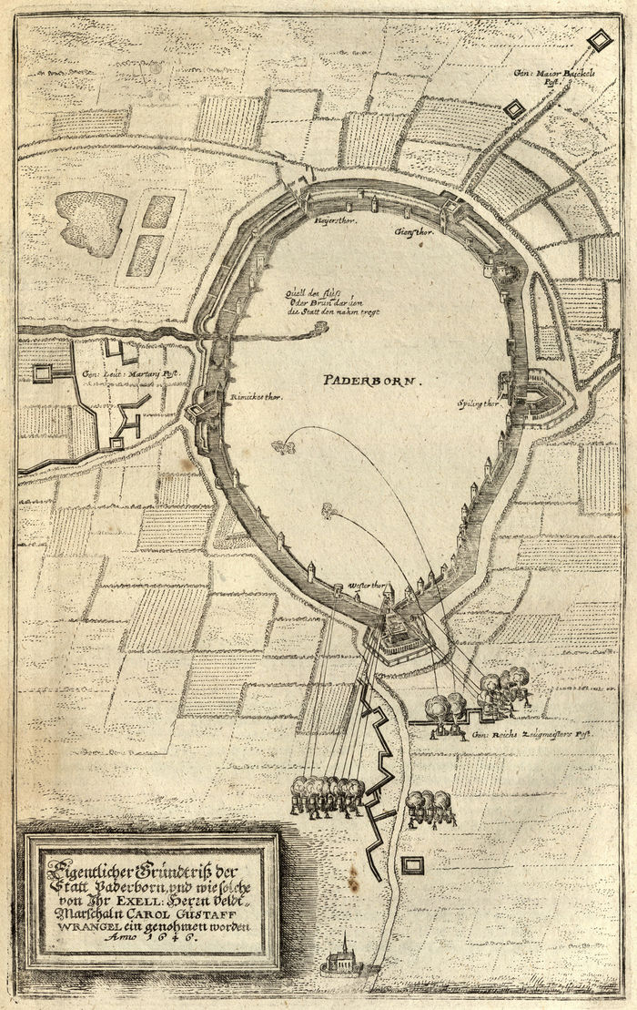 Originaltitel: PADERBORN. Eigentlicher Grundtriß der Statt Paderborn, vnd wie solche von Jhr EXELL: Herrn Veldt-Marschaln CAROL GUSTAFF WRANGEL ein genohmen worden Anno 1646.
