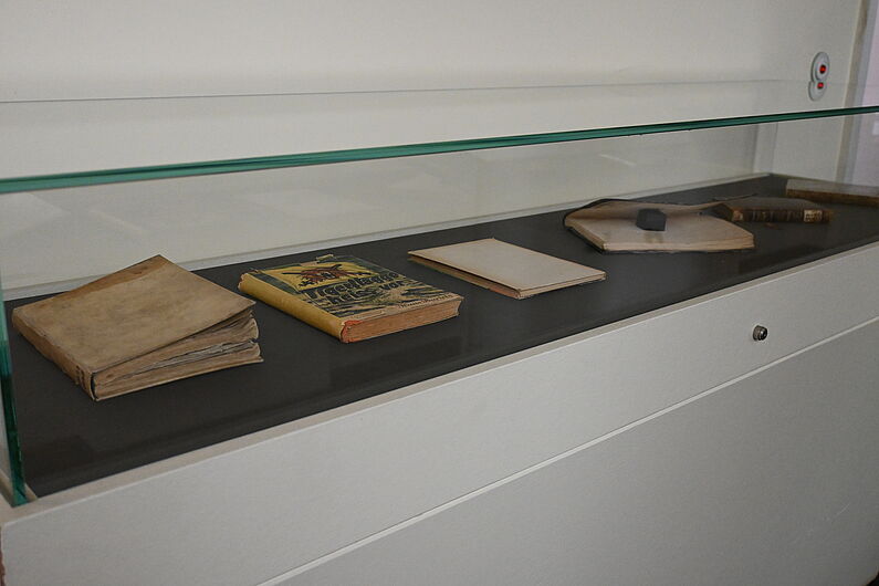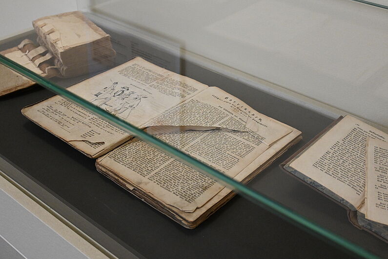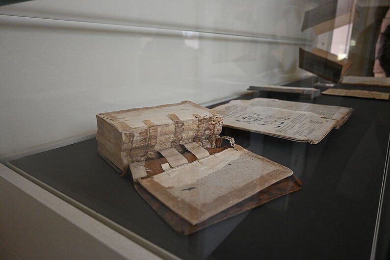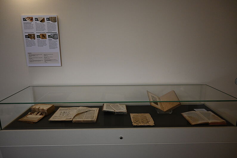 Vitrinenausstellung zu Schadensbildern von Büchern