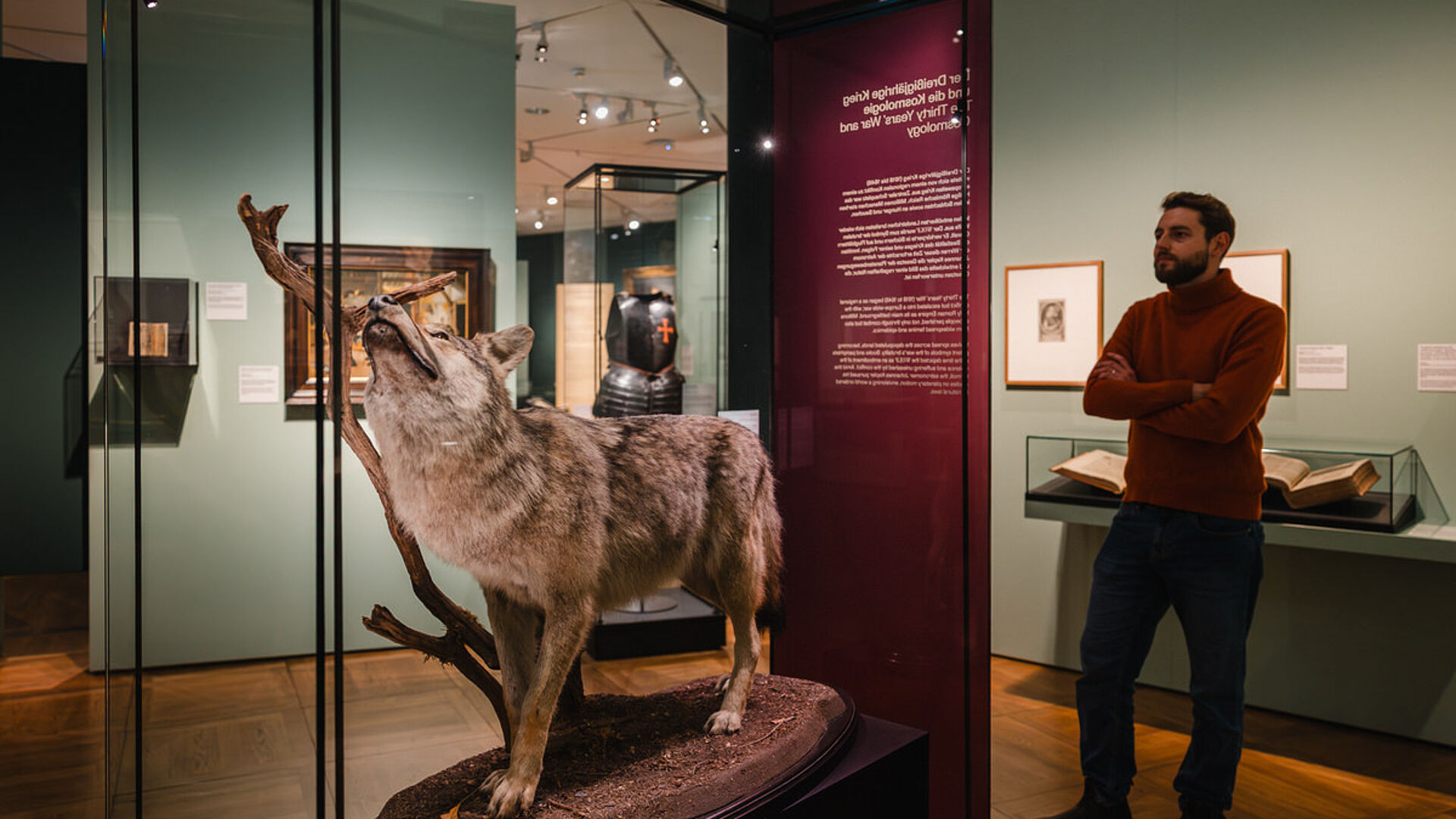 Der „Tag des Wolfes“ wird jährlich vom NABU ausgerufen, um für mehr Akzeptanz in der Bevölkerung zu werben. Die Themenführung bietet Einblick in eine Vielfalt von Zuschreibungen, die in den vergangenen Jahrhunderten den Blick auf die Tiere prägten und unsere Vorstellungswelten weiterhin beeinflussen. Gerade der Wolf wurde einerseits symbolisch aufgeladen und andererseits mit menschlichen Eigenschaften überfrachtet. Literarische Zeugnisse, Bilder und ein präparierter Wolf erzählen in der Ausstellung von historischen Projektionsflächen. Aber auch andere Objekte wie eine Taube als Symbol des Heiligen Geistes oder Alfred Brehms Tiere des Waldes führen in zeichenhafte und historische Welten, was in dem Rundgang ebenso thematisiert wird wie Darstellungen und Deutungen von anderen Tieren in mehr als 800 Jahren deutscher Geschichte.